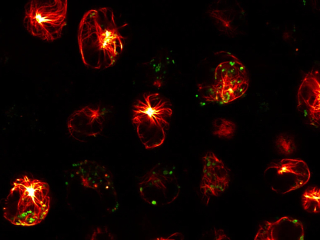 Killer T cells are important disease-fighting members of the immune system. Experiments in the lab show how they rapidly kill one cell after the other with a unique cocktail of chemicals fired out in deadly packages called cytotoxic granules. But like an athlete that shines in training but chokes in the big games, T cells seem to work much more slowly in their natural environment. To understand how they function in the body, researchers genetically modified mice to add a fluorescent tag (green, with the structures that support T cells labelled red) onto a protein in the granules, and used microscopy to observe the T cells in action as they fought off invaders. Getting a glimpse at this process could answer questions about how they interact with other cells in the body, and might provide clues on how to enhance their behaviour to better tackle threats like cancer and viruses.