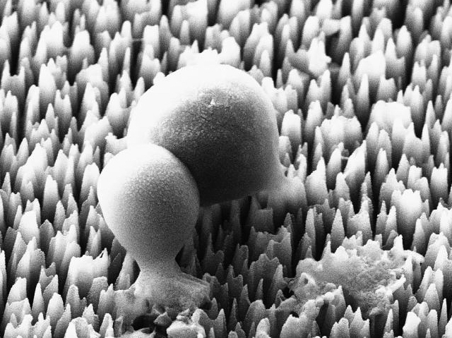 Disease-causing bacteria are formidable foes at the best of times but are particularly menacing in cases of medical device-associated infections. The surfaces of implanted devices, such as catheters and heart valves, can become coated in dense impenetrable bacterial biofilms – the microbial equivalent of nuclear bunkers – that surround and protect the bugs from both antibiotics and the patient’s immune system. With the aim of developing devices that can resist biofilm formation, researchers are taking inspiration from flying insects. The wings of dragonflies, cicadas and other insects are naturally antibacterial, having nanostructures that can pierce and slice bacterial cells preventing them from getting a foothold. Pictured above is a manmade wing-inspired material – silicon nanoneedles – shown rupturing a Stapholococcus aureus bacterium. Researchers are continuing to develop such materials to maximise lethality to bacteria, safety to patients and feasibility for use in implants.