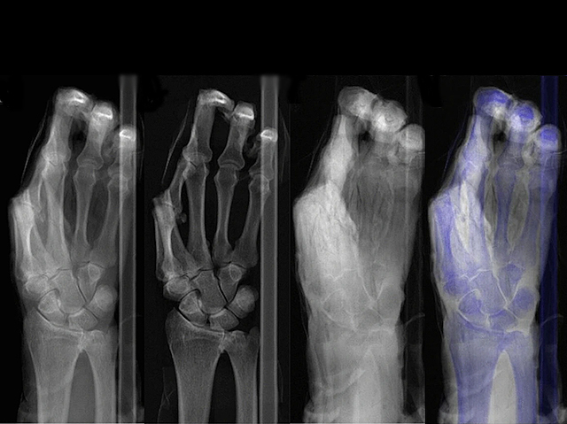 A burst of X-rays fired at a cadaver’s hand – passing through the skin at 186,000 miles per second, invisible to the eye but casting a black and grey pattern around white bones dense enough to absorb the radiation. Standard X-ray radiography scans, usually known as 'X-rays' (like the one of the left here) are commonplace in hospitals, where they’re used to spot broken bones. Yet minor fractures are sometimes missed, especially when surrounding soft tissue is dense enough to appear similarly coloured to bone. While this hand has no bone breaks, it’s helping to test a different technique – photon-counting dual-energy radiography – where an algorithm helps to distinguish bone (middle left) from surrounding tissue (middle right), presenting a more complete, overlaid picture (right). Radiologists found this more informative than X-rays alone, potentially helping to spot subtle bone injuries that, left untreated, may otherwise lead to conditions like arthritis.