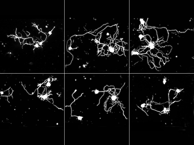 Unlike the neurons in the central nervous system (CNS), those outside the brain and spinal cord – the peripheral nervous system (PNS) – can regenerate their ‘electrical cable’-like fibres (axons) after injury. Understanding how this happens could be of huge benefit for treating a range of conditions such as stroke, spinal cord injury and others in both the CNS and PNS. Researchers have now discovered in mice that the levels of a protein called RSK1 are higher after sciatic nerve injury. Forcing neurons to over-produce RSK1, caused an increase in two proteins called BDNF and IGF1 that helped regrow the neuron’s axon. Here we see a ‘normal’ neuron (top left) and longer neurons with increased levels of RSK1 (top middle and right). By inhibiting either BDNF (bottom left), IGF1 (bottom middle) or both (bottom right), the regrowth of the axons was impaired, suggesting RSK1 is essential for regeneration of these signal-transmitting projections.