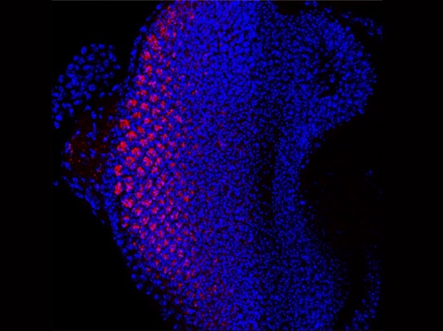 Fruit flies (Drosophila melanogaster) share many of our genes, making them useful model organisms – scientists often draw lines between clues in the fly and human tissues. Here they study a bed of neurons in a fly’s retina (with its cells highlighted in blue). They modify the cells to make higher levels of a protein called Tom40 (red) and watch what happens next. In humans, a similar Tom protein is associated with Alzheimer’s disease, but the link – the mechanism – is clouded by the activity of other genes and proteins. The simpler genetics of Drosophila provide a clearer picture – too much Tom destroys neurons by upsetting processes in the cells’ mitochondria, so much so that the cell triggers a form of self-destruct called apoptosis. The next step is examining the link between apoptosis and Alzheimer’s disease in human neurons with a view to developing therapies to keep Tom in check.