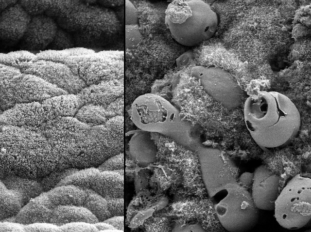 Usually found in hospitals, positron emission tomography (PET) scanners are chamber-sized devices that help to diagnose diseases, spotting changes in how tissues metabolise or break down chemical tracers in a similar way to sugars. The approach helps millions of people during diagnosis, but using PET for research on mammals is expensive with many ethical issues. On the hunt for alternatives, scientists turn to caterpillars. Similar enough to humans in their genetics and large enough that their insides can be inspected by PET, the larvae of the tobacco hornworm (Manduca sexta) make excellent model organisms. Here, using electron microscopy the gut of a healthy caterpillar (left) is compared with cells changed by a bacterial infection (right) – mimicking inflammation seen in colitis – which can be reversed with antibiotics. Caterpillars may have lots to teach us not only about how certain inflammatory diseases progress, but also how researchers might improve and expand on techniques like PET.