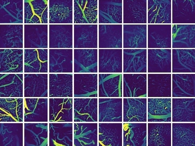 Imaging blood vessels is a part of research into all sorts of conditions, from stroke to Alzheimer’s. Analysing these data requires a process called blood vessel segmentation where blood vessels are identified from non-vessel tissue. With large volumes of imaging data, segmentation needs to be automated using computer algorithms. For this to be effective, algorithms first need to be trained on existing data. This currently relies on proprietary software where training data isn’t openly available or open-source software where training data isn't comprehensively labelled with what's what. Researchers now present MiniVess, a dataset of 70 3D image volumes of rodent brain blood vessels (a selection is pictured), imaged using two-photon fluorescence microscopy and labelled in detail. This was created using U-Net, a type of deep learning called a convolutional neural network. It is publicly available and will help train algorithms to analyse future blood vessel imaging data in brain research.