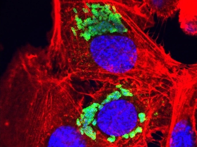 Like a husky and a dachshund, two strains of the same bacteria species can have very different characteristics, honed in different parts of the world. Salmonella Dublin (pictured, green, infecting human intestinal lining cells) is a bacteria that causes serious blood infection in humans all around the world (not just in Dublin). Researchers examined two main types, and 1300 different strains from 13 countries to determine the genetic foundation behind important differences. They found that Salmonella Dublin from the USA was more likely to be resistant to antibiotic treatment – a growing global treatment issue – than Australian counterparts, and that they all lack a key snippet of DNA that many new vaccines target. This helps narrow down potential treatment options locally and management plans globally, while understanding how evolutionary pressures in different regions have led to particular characteristics may point to new strategies to counter the looming threat of antimicrobial resistance.