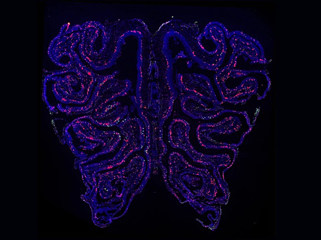Experienced chefs can smell subtle herb fusions – their senses honed over years. A new study suggests this expert nose may be the result of additional neurons that develop in response to exposure to specific smells. The olfactory epithelium, tissue lining the nasal cavity, produces new odour-sensing neurons in a process long-assumed to be a natural renewal, replacing old for new and generating random subtypes of neurons tailored to different odours. But recent evidence suggested some subtypes were more likely to develop than others in certain situations, so researchers blocked one nostril of mice and exposed them to male scent. They found that this exposure selectively boosted the growth of neurons that sense those odours (pictured, with proliferating neurons pink in a section of mouse olfactory epithelium). Understanding this sensory training might provide new routes to treatments for people who have lost their sense of smell.