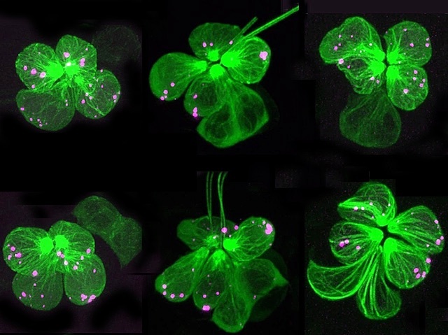 Helping to develop our eyes and ears, specialist hair cells form the early link between our senses and the outside world. Here, scientists examine bundles of zebrafish hair cells (artificially highlighted in green), to see how they form early synapses – junctions that connect up with the rest of the developing nervous system. They know the process depends on chemical structures called ’ribbons’ (pink). Exactly how is a little mysterious, but there are clues. Treating the cells with drugs which disrupt microtubules – like a tiny rail network which transport chemical cargos around tissues, leaves more ribbons 'stranded' in the hair cells (middle column compared to left or right columns). Researchers believe ribbon cells normally use microtubules to travel to the sites of new synapses during development and looking for similarities in human tissues may help to understand several developmental disorders.